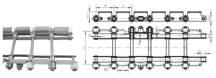 | Pitch P (mm) | Inner width of inner link b1 (mm) | Diameter of pin d2 (mm) | Diameter of roller d1 (mm) | Height of sidebar h2 (mm) | Thickness of sidebar T (mm) | Pitch of attachment L (mm) | Central distance of attachment L1 (mm) | Hole diameter of attachment d4 (mm) | Height of attached side plate h4 (mm) | Tensile strength (KN) |